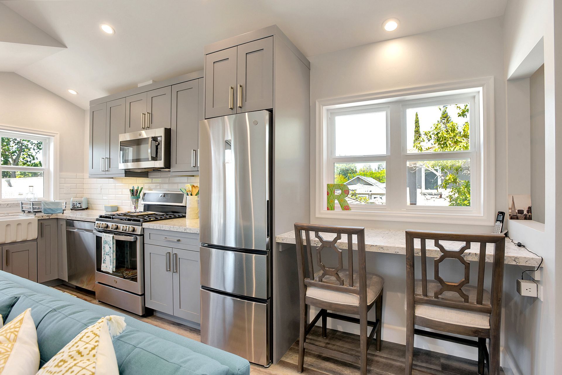 This main home addition and ADU over the garage addition was a project deeply personal to our clients. They dreamed of creating a cozy place to host relatives, entertain guests, and simply relax and enjoy their time. Their transitional design style created a home that is indeed warm, charming, and delightful to occupy. From the adorable entryway mudroom to the practical home gym, this project included many customized features. Beyond the interior upgrades and expansion, an outdoor living area with a deck and bar provides just the inviting aspect our clients envisioned.